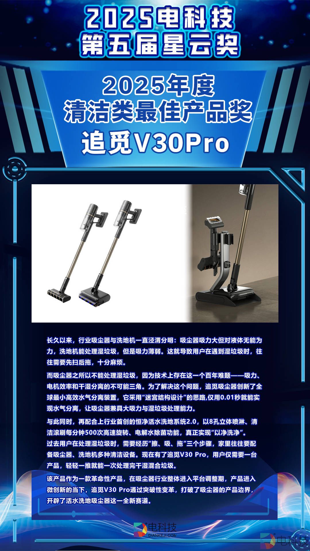 该产品作为一款革命性产品,在吸尘器行业整体进入平台调整期,产品进入微创新的当下,追觅V30 Pro通过突破性变革,打破了吸尘器的产品边界,开辟了活水洗地吸尘器这一全新赛道。
