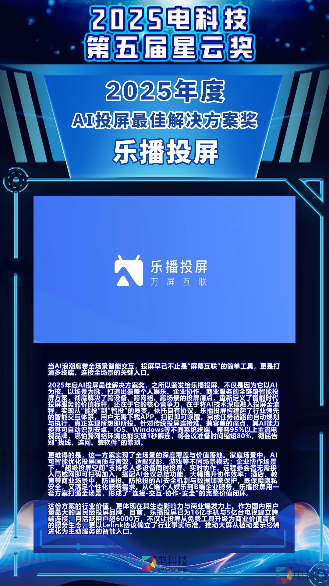 2025年度AI投屏最佳解决方案奖,之所以颁发给乐播投屏,不仅是因为它以AI为核、以场景为脉,打造出覆盖个人娱乐、企业协作、商业服务的全链路智能投屏方案,彻底解决了跨设备、跨网络、跨场景的投屏痛点,重新定义了智能时代投屏服务的价值标杆。还在于它的核心竞争力,在于将AI技术深度融入投屏全流程,实现从“能投”到“智投”的质变。依托自有协议,乐播投屏构建起了行业领先的智能交互体系,用户无需下载APP,扫码即可唤醒,完成任务链路的自动规划与执行,真正实现所想即所投。针对传统投屏连接难、兼容差的痛点,其AI能力使其可自动识别安卓、iOS、Windows等不同系统终端,兼容95%以上主流电视品牌,哪怕跨网络环境也能实现1秒瞬连,将会议准备时间缩短80%,彻底告别“找线、连网、装软件”的繁琐。