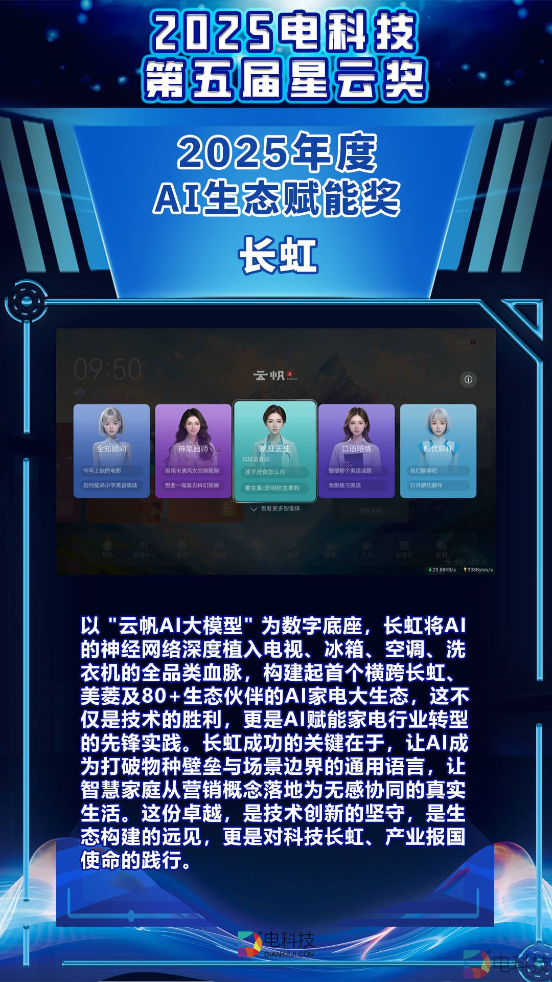 以 "云帆AI大模型" 为数字底座,长虹将AI的神经网络深度植入电视、冰箱、空调、洗衣机的全品类血脉,构建起首个横跨长虹、美菱及80+生态伙伴的AI家电大生态,这不仅是技术的胜利,更是AI赋能家电行业转型的先锋实践。
