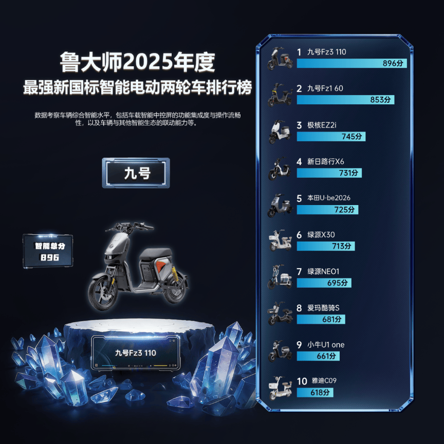 九号 Fz3 110 荣获“2025年度最强新国标智能电动两轮车”。在严格新国标框架下,九号仍通过顶配鼹鼠控与凌波OS完成体验跃升,在限制中创造高效智能化方案,以“更聪明、更便利、更可靠”的综合体验拿下年度奖项。