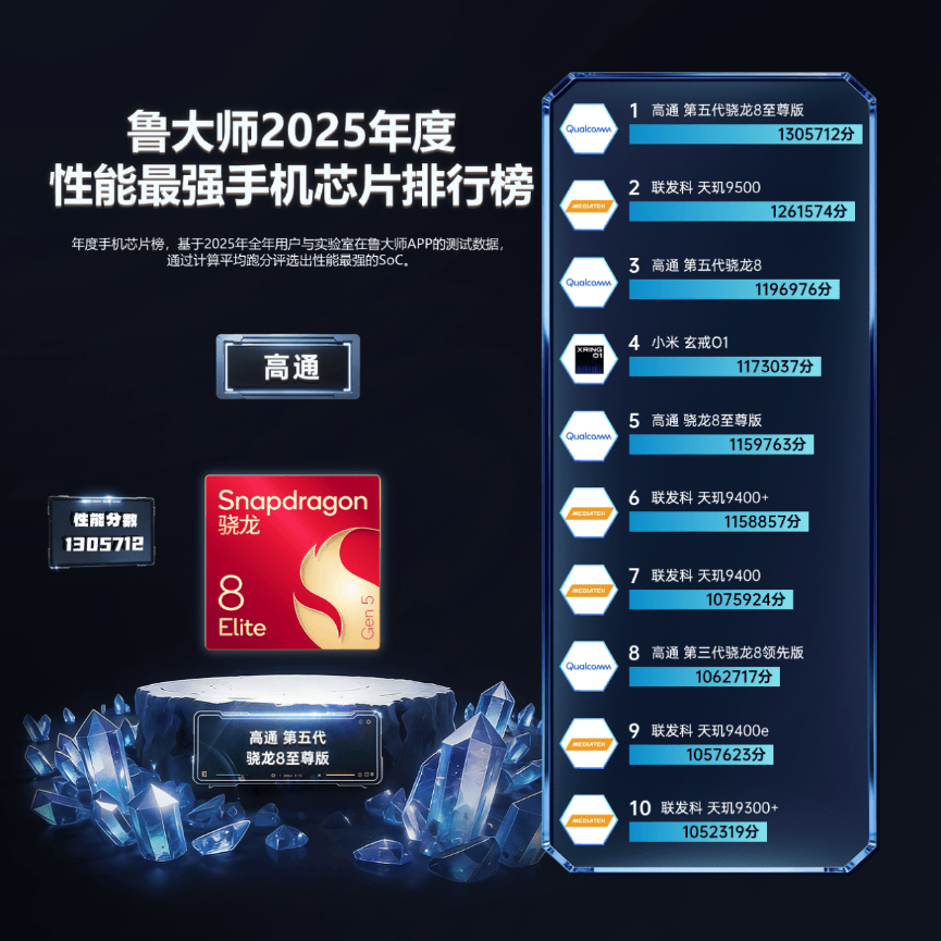 高通第五代骁龙8至尊版 荣膺“2025年度性能最强手机芯片”。凭借台积电第三代 3nm 工艺与最高 4.6GHz 超级核心,其以 1305712 超高跑分 进一步刷新移动端性能上限,覆盖 CPU、GPU 与 AI 算力综合升级,为旗舰手机体验提供最关键的底座支撑。