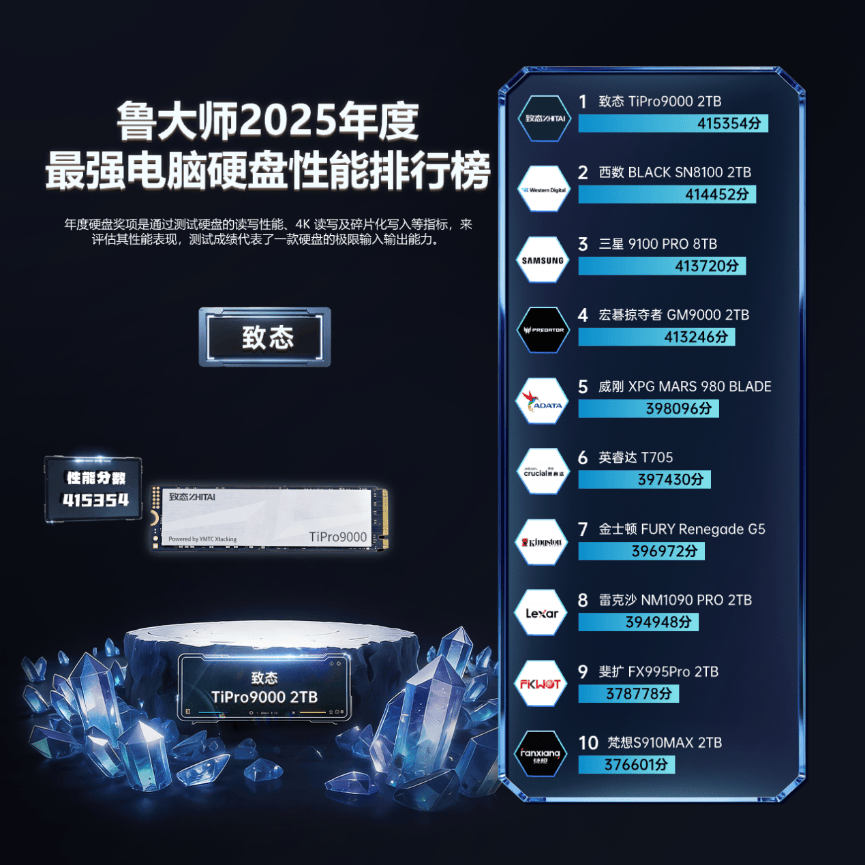 致态 TiPro9000 2TB 荣获“2025年度最强电脑硬盘性能”。搭载晶栈 Xtacking 4.0 架构,它在 PCIe 5.0 赛道跑出 14000MB/s 级别读取表现,以自研闪存与强悍主控构建持续写入与高负载吞吐能力,向行业展示了国产存储在高端性能区间的关键突破。