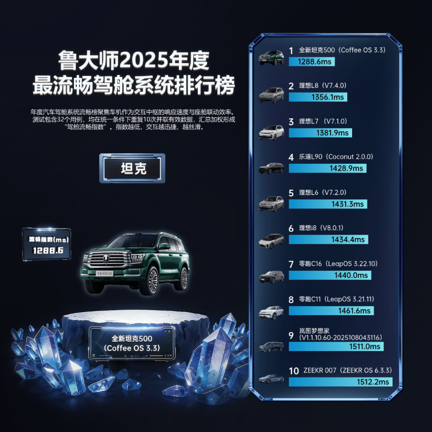 全新坦克500(Coffee OS 3.3) 获评“2025年度最流畅驾舱系统”。它以 1288.6ms 的流畅指数刷新纪录,在导航切换、语音唤醒等高频场景全面领跑,证明硬派越野不仅能征服复杂路况,也能把智能体验做到行业顶尖。