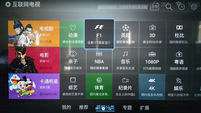 进入在线视频选单,满屏的分类区域显示出乐视生态下,内容的强大,超过10万集电视剧、超5000部电影以及像是F1这样的独家体育赛事,多方位满足用户需求。