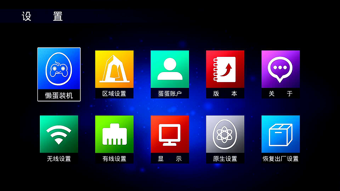 设置分为懒蛋装机、区域设置、蛋蛋账户、系统设置、版本、显示等功能,其中懒蛋装机可以让您一键装机,操作简单快捷。