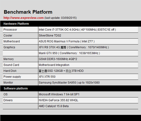测试平台基于超频至4.0GHz的Core i7-3770K处理器打造,配置有华硕ROG Maximus V Formula主板、GSkill DDR3-1600 8GB双通道(4GB*2)内存以及讯景XTR 550电源,操作系统使用的是Windows 7 64-bit SP1旗舰版,GTX 950显卡使用的是GeForce 355.82 WHQL驱动,R9 370X显卡使用的是Catalyst 15.8 Beta驱动。
