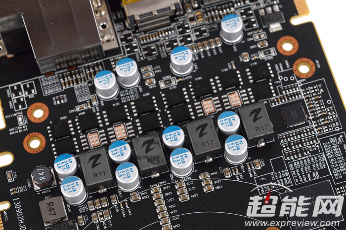 讯景R9 370X魔尊版显卡配置有4相核心供电,每相均采用全固态电容和铁素体电感设计,配置有“一上二下”共计三颗MosFET,可以满足Trinidad XT核心的供电需求。