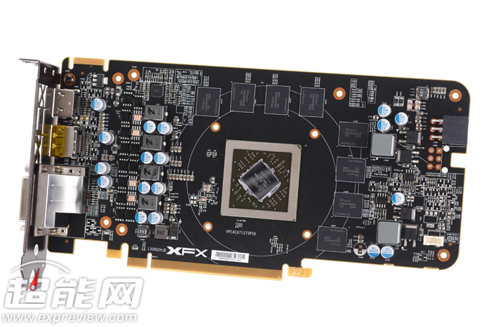 讯景R9 370X魔尊版显卡采用4+1+1相供电设计,其中4相为核心供电,位于GPU的左侧,而1相显存供电和1相I/O供电则位于GPU的右侧,8颗GDDR5显存颗粒全部布置在PCB正面,显示输出接口则全部有做EMI金属屏蔽罩。