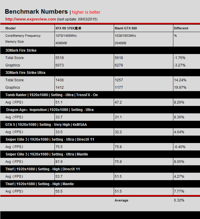 从测试成绩来看,R9 370X显卡的性能已经追平甚至是超过了GTX 950显卡,在一些支持Mantle API的游戏中,R9 370X显卡的表现还会有进一步的提升,不过综合下来领先的幅度并不是很大,大概是在6%到7%左右,在实际游戏中影响并不明显。