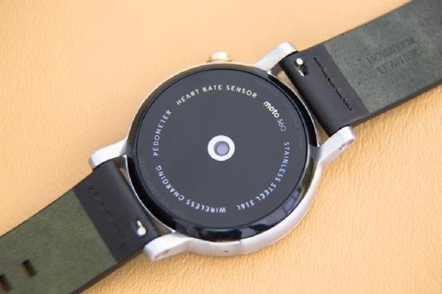 如其他产品一样,Moto 360也将心率传感器放置在了表身的后部,小型的镜头偶尔会发出绿色光线,用来读取用户心率。但是,这种类型的传感器有一定的缺陷,其理论上会利用绿色光线穿透皮肤,到达血液表面,然后产生反射并被传感器接收,进而读取心率数据,而此时如果手臂或手表处于移动状态中的话,相应的读数将会变得非常不精确。