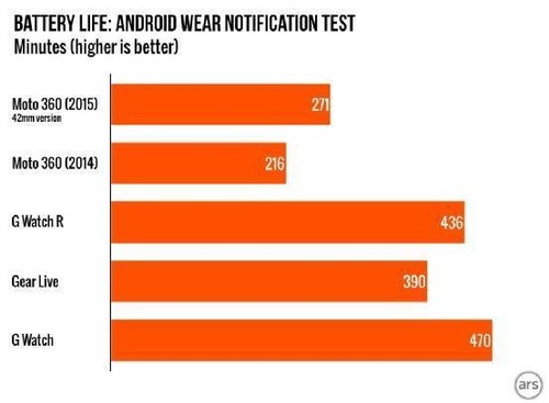 针对不同手表间续航时间进行的比较只能提供大致参考,因为手表不同于手机,不可能将它们的屏幕亮度调节至同一水平下。测试人员通过蓝牙连接,每间隔15秒便向手表发送一条消息并模拟一次屏幕点击,在这种情况下,尺寸为42mm的Moto 360凭借一块容量为300毫安时的电池坚持了近5小时。