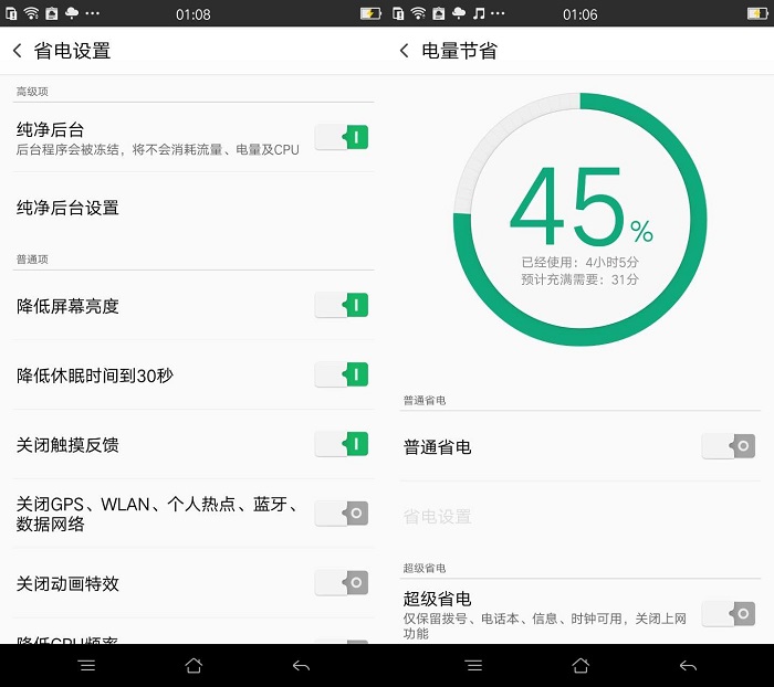 作为OPPO知名度最高的宣传语:充电5分钟,通话2小时。升级后的R7s更是将R7系列的省电做到了极致,首先在机身厚度仅仅增加0.6mm的基础上将电池升级为3070mAh,配合ColorOS的省电精灵智能管理,以及在黑阶下几乎不耗电的AMOLED显示屏在官方给出的重度使用测验中.13小时15分钟的试用时间完全足够一个用户使用一整天了。而且配合VOOC低压快充功能,随时利用碎片时间让R7s保持较高的电量。