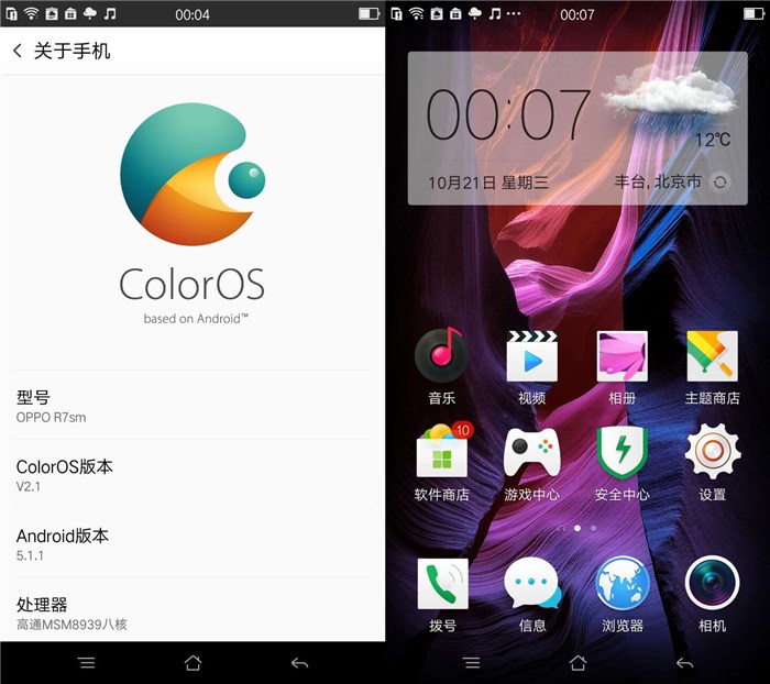 全网通版R7s运行的是基于安卓5.1版本的ColorOS 2.1 ,在如今手机UI设计上扁平化潮流中,ColorOS依然坚持着自己固有的特点,桌面图标虽然感觉像拟物化,但去掉部分阴影后也有扁平的质感。配合其他品牌中也不常见的4G运行内存,使用起来相当高效流畅。此外ColorOS 2.1中集成了睡眠保护功能,手势体感功能、生活服务、及OPPO的会员服务等。