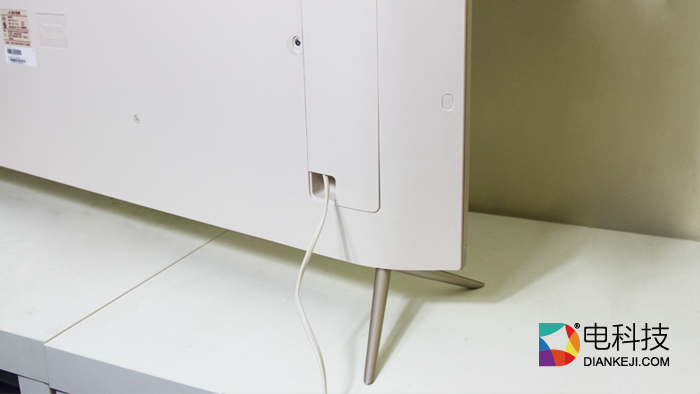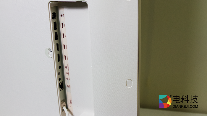 电视背面采用两段式设计,所有接口都隐藏在了遮罩盖板下,常用的HDMI和USB接口各有两个。