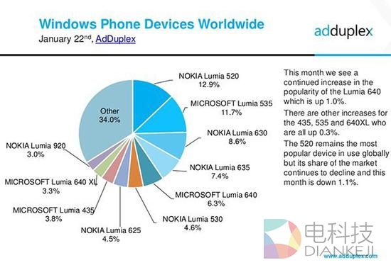 QQ/微信不更新了 WP要以怎样的方式死去 WP手机高销量榜首仍是两年前的Lumia520(图片来自adduplex)