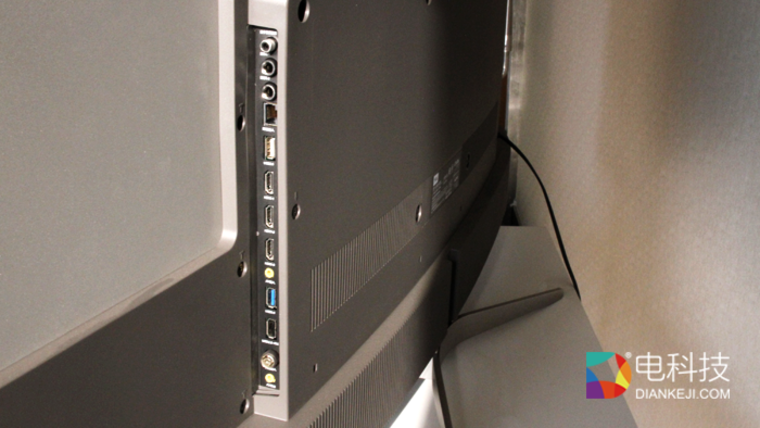 由于没有采用分体式设计,TCL L55C1-CUD在机器背面采用两段式凸起以容纳更多的内部元件,布局还是极为规整的,各种接口集中在背面的左侧,常用的主要包括网线接口、三个HDMI接口、一个USB 3.0接口以及上下两个USB 2.0接口,有些特殊的是,在最上方加入了单独的两个麦克风接口,预示着TCL L55C1-CUD在家庭卡拉OK体验上会有着不凡的表现。
