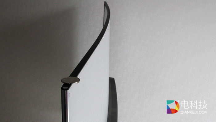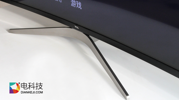 TCL L55C1-CUD的底座支架设置在机器的中心位置,采用金属四脚式设计,利用中轴线固定电视的方式显然更贴合曲面的产品风格,屏幕底部TCL Logo下还有显示产品工作状态的呼吸灯,算得上是机器正面的点睛之笔。