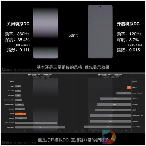 其中iQOO 9采用了一块三星E5发光材质直屏,120Hz刷新率,局部峰值亮度可以达到1500nit,相比E4屏,这块屏幕能够节省25%的电量,算是目前安卓最佳直屏。对于眼睛敏感的朋友来说,即便iQOO 9采用的是OLED 屏幕,但有B站UP主评测发现iQOO 9在应用新的DC调光方案后,频闪比其它非LTPO机型更低,与此同时也没有牺牲显示效果,这一点很难得。甚至可以说,iQOO 9是目前最护眼的骁龙8旗舰机型了。