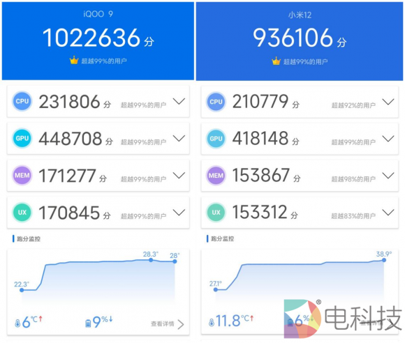 在基础性能方面,两款机型均搭载了骁龙8+LPDDR5+UFS 3.1的硬件组合,而这套硬件,至少也是今年上半年旗舰手机的天花板配置,不过从网上的测试成绩来看,iQOO 9的安兔兔测试可以轻松破百万,小米12大多在95万以内,实际表现有一定的。