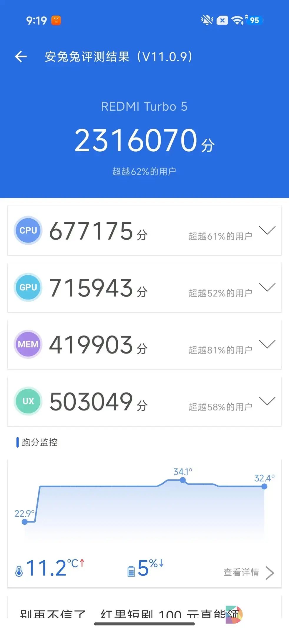 经过实测,REDMI Turbo 5的安兔兔常温跑分成绩约为 231 万,Geekbench 6 单核得分 1729,多核得分 6998,处于当前中高端市场的领先水平。