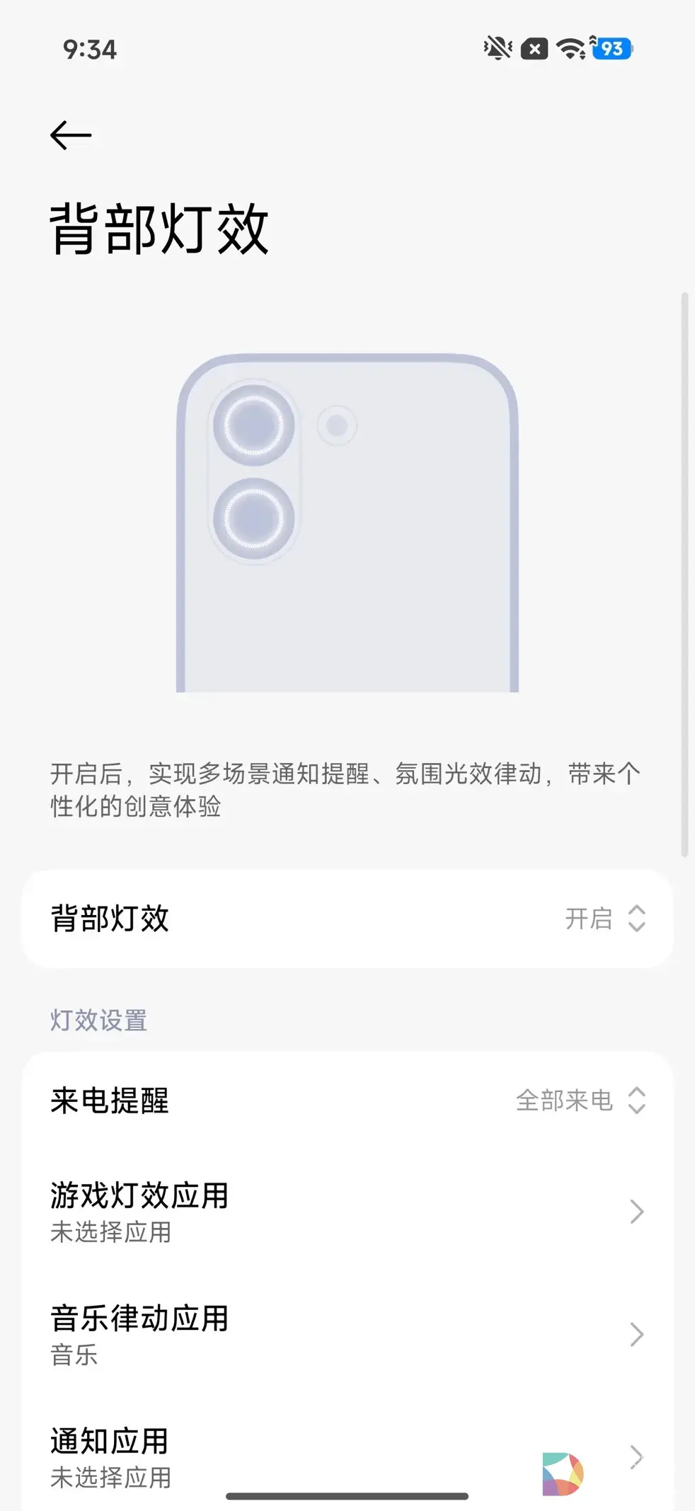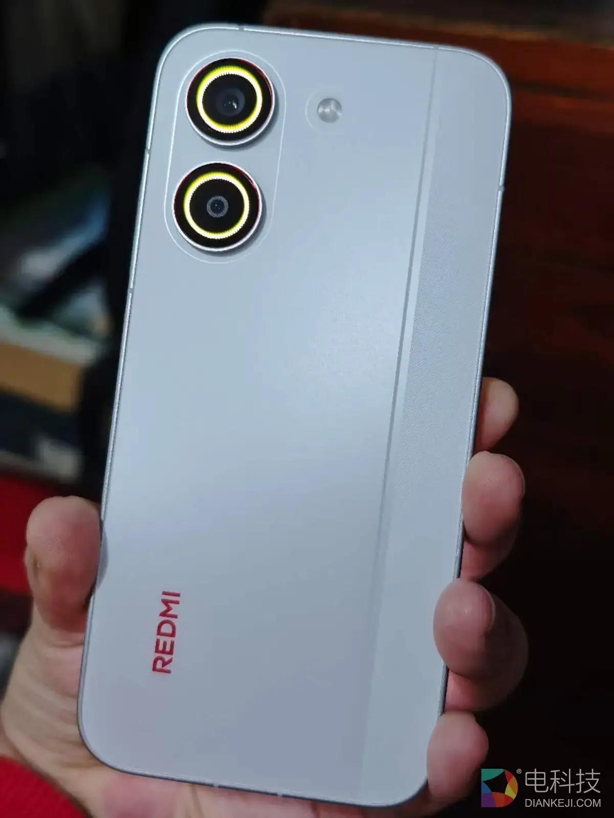 双摄镜头deco采用了竖向排列的方式,但REDMI依然在此处上融入了自己的小巧思,那就是“焕新双环灯带”。这个灯带的存在既不会有乱花迷眼、喧宾夺主的凌乱感,同时在为整机添加更多灵动的同时,又可以起到消息通知提示的实用作用,属于是令人眼前一亮的小设计。