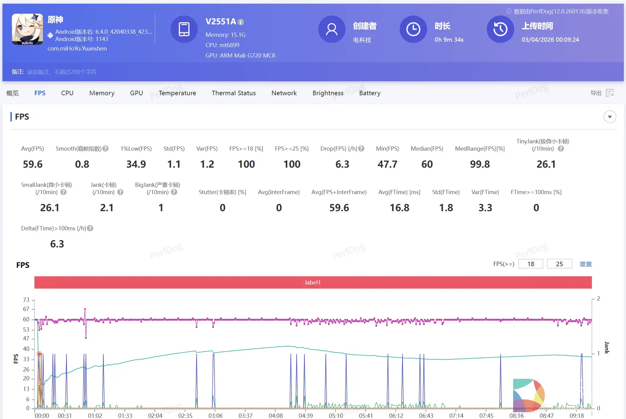 对于性能要求比较大的游戏,最高画质下《原神》平均帧数稳定在59.6fps,整体流畅度相当不错,没有出现明显的卡顿掉帧。更难得的是功耗控制,半小时仅消耗约8%电量,配合上9020mAh大电池,能够实现画质拉满下数小时的连续游玩。