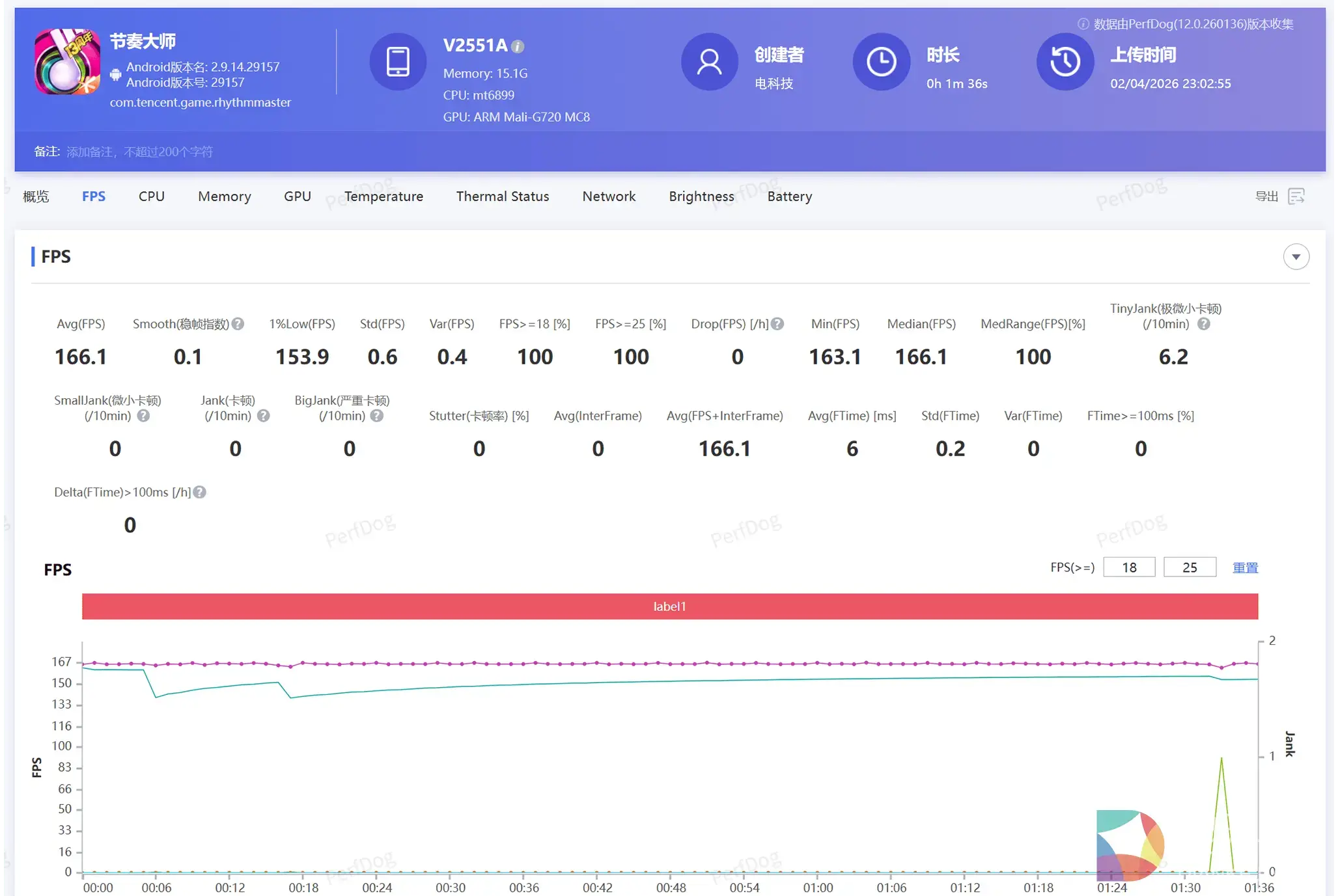 在对于操控相应要求较高的音游《节奏大师》下,平均帧数可达166.1fps,操作反馈及时,能够满足高响应反馈的要求。