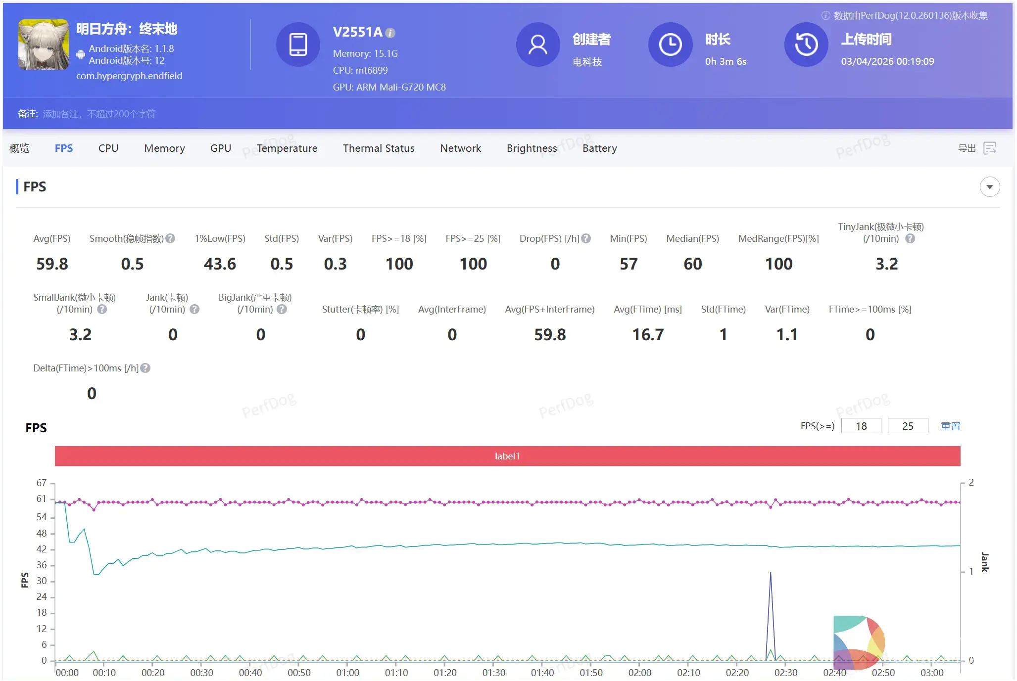 最高画质下《明日方舟:终末地》平均帧数稳定在59.8fps,表现同样不错。