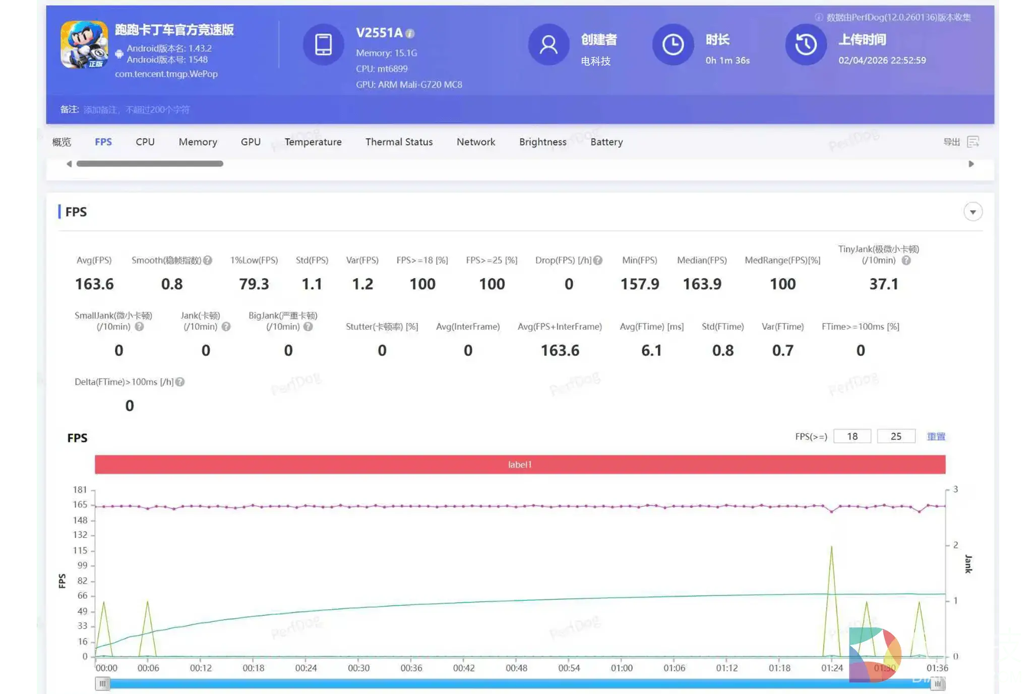 在帧数开到最高档下,《跑跑卡丁车官方竞速版》平均帧数稳定在163.6fps,游戏过程中驾驶丝滑流畅,反馈顺畅。