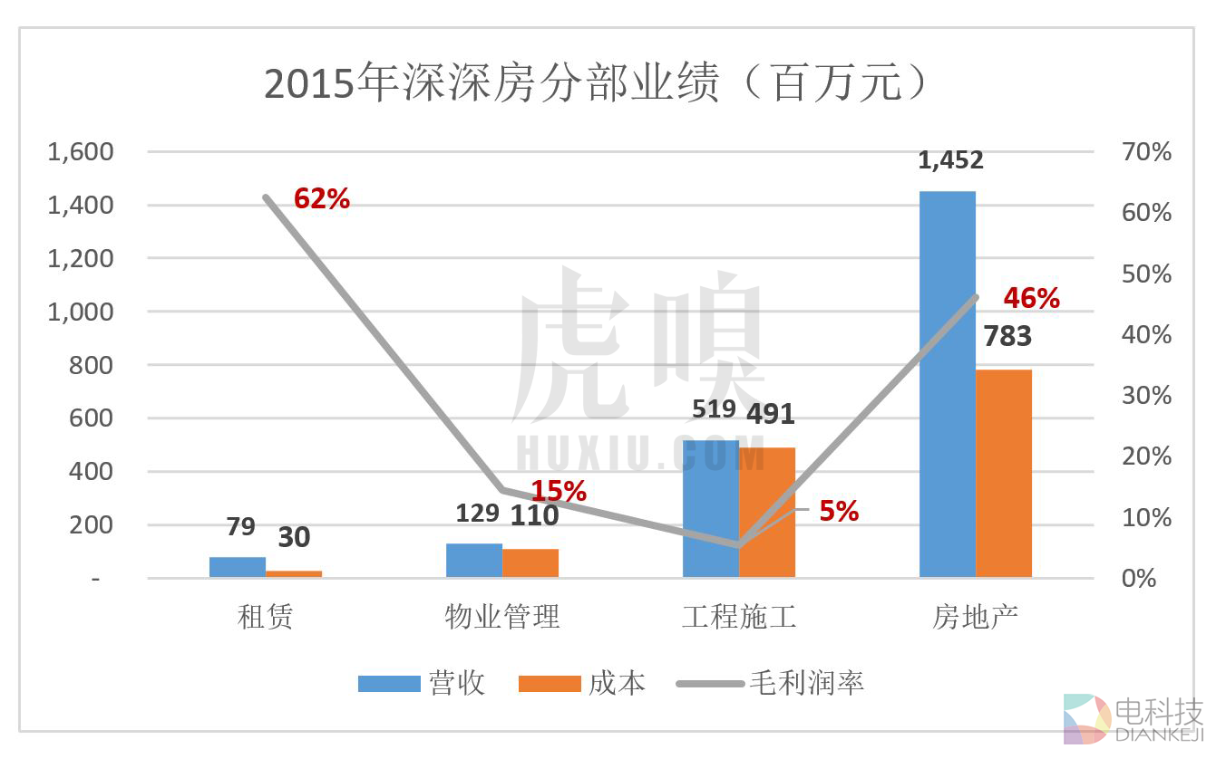 2015年,房地产业务毛利润率为46%,净利润率约为20%;工程施工、物业管理净利润率几乎为零。