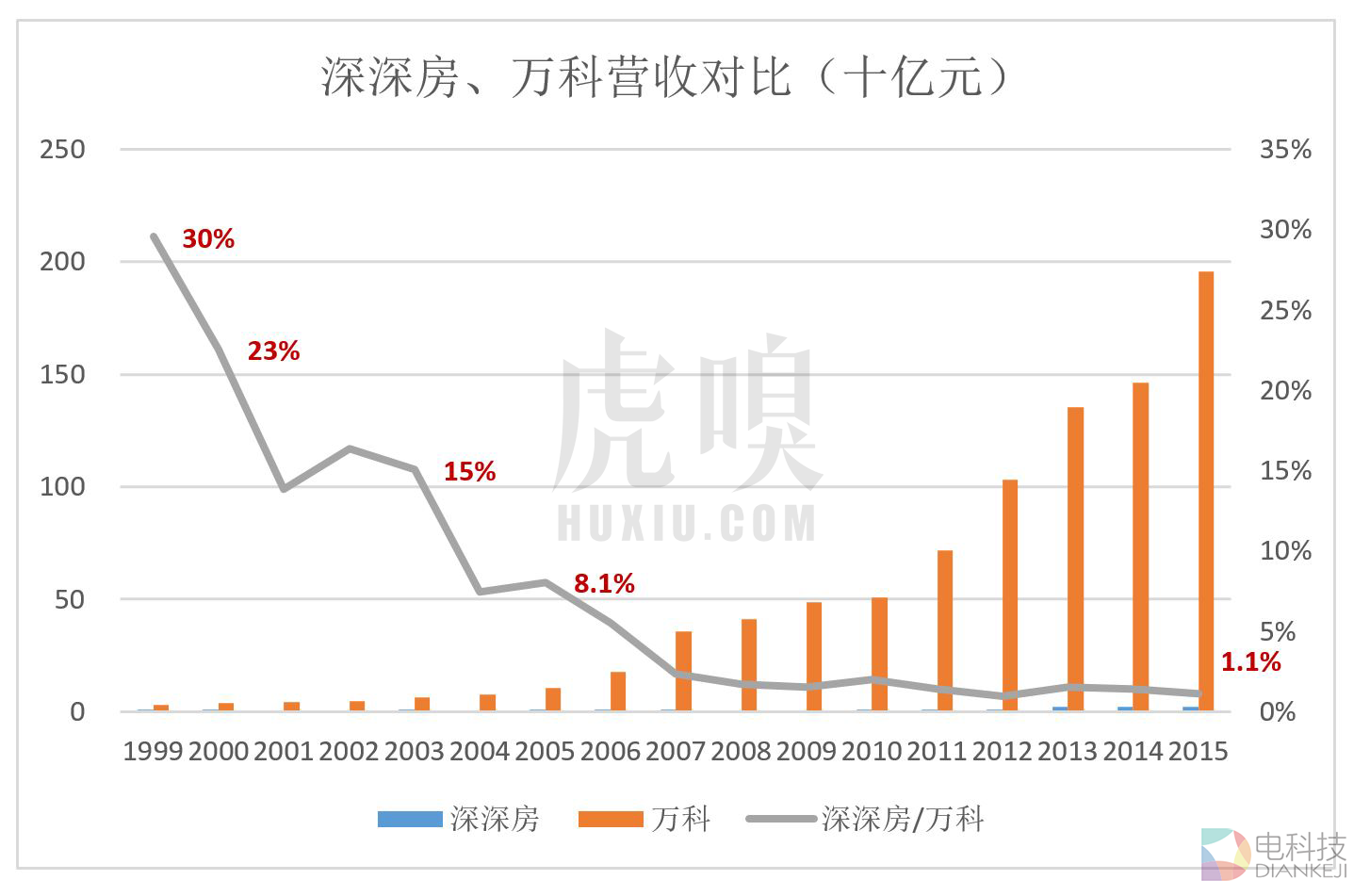 不怕不识货,就怕货比货,货比货得扔。1993年深深房营收相当于万科的89%,2000年这个比例降至23%,2015年,深深房营收仅为万科的1%。