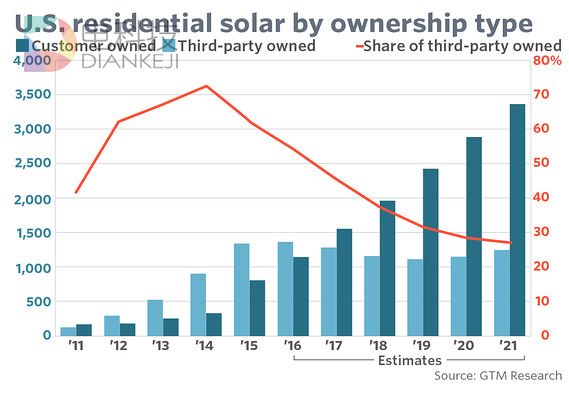但是,SolarCity的这种模式可能无法再继续运行下去。市场研究公司GTM Research预计,2017年,多数用户将以现金或贷款的方式直接购买太阳能系统。GTM称,租赁或第三方拥有的太阳能系统占据了今年太阳能系统市场的大约54%,明年将降至45%,未来5年内将逐步降低至30%以下。