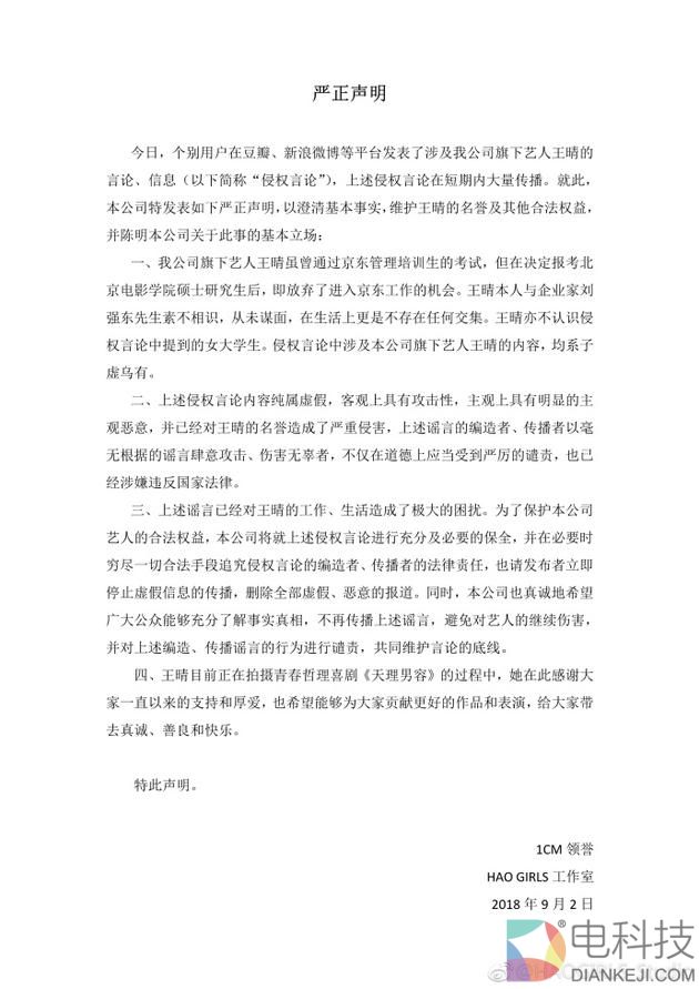 9月2日晚,创造101选手王晴经纪公司“HAOGIRLS_Studio”官方微博发表严正声明,称创造101选手王晴虽有通过京东管理培训生的考试,但在决定报考北大电影学院硕士研究生后就放弃了进入京东工作的机会,与刘强东素不相识,从未谋面,生活上更是不存在交集,当然也更不认识侵权言论中提到的大学生,系子虚乌有。
