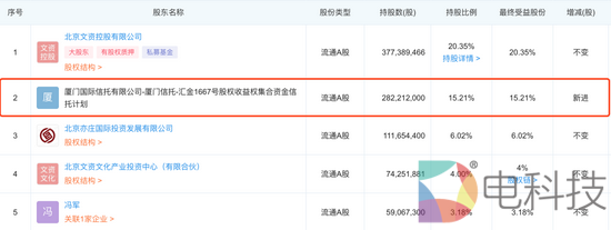 今年3月1日,文投控股公布称,依据北京市第二中级人民法院执行裁定,耀莱文化持有的公司2.82亿股无限售条件流通股股票已于2021年3月1日完成划转,股份受让人为厦门国际信托有限公司-厦门信托-汇金1667号股权收益权集合资金信托计划。本次股份过户完成后,耀莱文化持股比例降为1.14%,厦门信托持股比例15.21%。