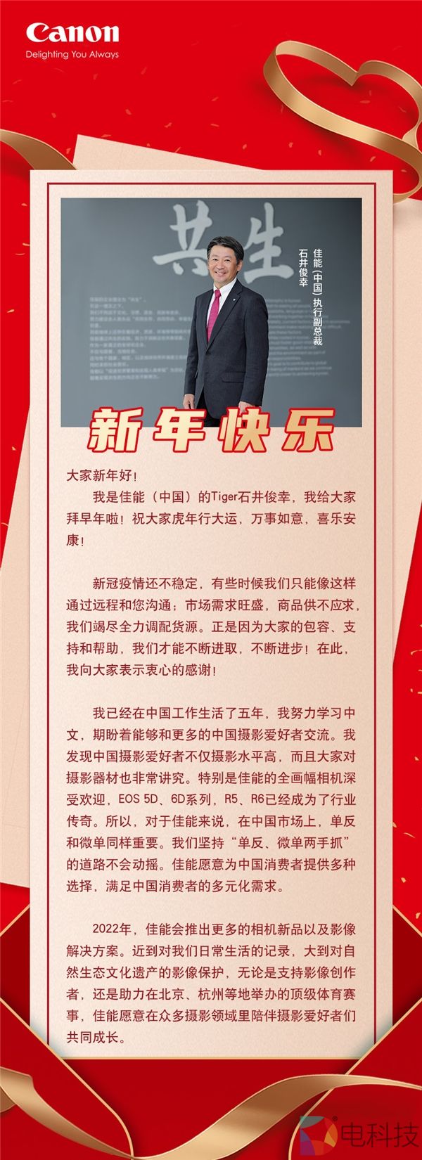 今日(1月7日),佳能官方发布拜年海报,佳能(中国)执行副总裁石井俊幸先生发表2022年新春祝语,祝中国消费者虎年行大运,万事如意,喜乐安康。同时他表示,2022年在中国市场上,佳能将坚持“单反、微单两手抓” 的道路不会动摇。佳能愿意为中国消费者提供多种选择,满足中国消费者的多元化需求。针对目前市场需求旺盛,商品供不应求,佳能也正在竭尽全力调配货源。