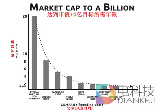 我们当前正处在一个创造着空前价值的时代,该时代的标志就是“独角兽”级别公司的逐渐增多,独角兽——一个可以迅速达到十亿级别以上市值的公司。当权威们再一次质疑“我们是否正处于泡沫之中?"时,企业家们提出的更多的是一个更实在的问题:“究竟有什么秘密可以让一个稚嫩的初创企业成长成一个独角兽级别的企业呢?“。如下图所示,当前已经有不少的创业者逐渐找到了破解该秘密的方法,因为这些公司大大缩短了从成立到成长为十亿级别市值的公司的时间。
