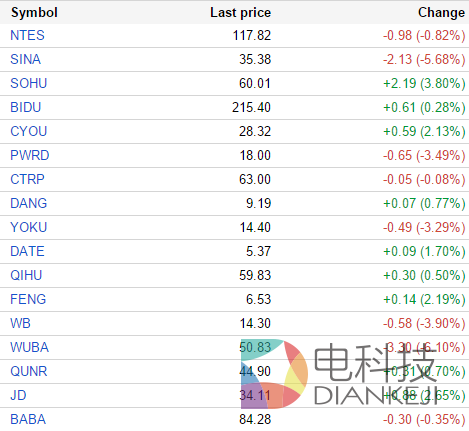 中国概念股周一涨跌互现。11只股票跌逾3%,其中四只股票跌超5%。新浪(NASDAQ:SINA)跌5.68%,第九城市(NASDAQ:NCTY)跌5.88%,58同城(NYSE:WUBA)跌6.10%,酷6传媒(NASDAQ:KUTV)跌6.82%。九只股票涨逾3%,其中四只股票涨幅在5%之上。聚美优品(NYSE:JMEI)上涨6.59%,学大教育(NYSE:XUE)上涨12.19%,久邦数码(NASDAQ:GOMO)上涨12.44%,航美传媒(NASDAQ:AMCN)上涨16.28%。