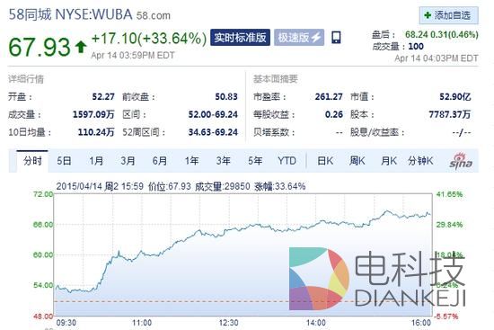北京时间2015年4月15日凌晨消息,58同城(NYSE:WUBA)周二收盘股价暴涨33.64%,涨17.1美元,报67.93美元。