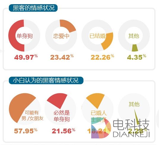 这样的年薪即使头戴黑客的光环,想要找女朋友也与普通宅男一样难吧!果然,调查中有一半的黑客还没找到另一半。这个比例与小白预期的57%略低,不过考虑到如今黑客中大多都是90后的“小鲜肉”,没有男女朋友也正常,要知道,雷锋网编辑部中,也有一半都没找到男(女)朋友。