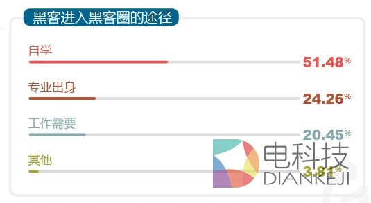 想要成为一名黑客,天赋很重要,很多黑客都是通过自学成才,而在GeekPwn的报告中,这一比例达到了51%,只有24%的黑客是经过专业系统的学习。这与大环境有关,虽然黑客被普遍认为是一群技术人员,但到目前黑客依然是一个比较敏感的人群,大多游走在网络的背后。
