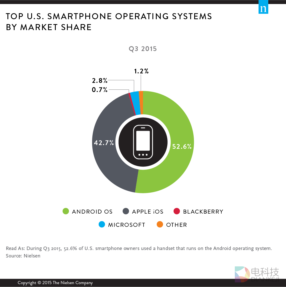 根据国外调研机构 Nielsen 提供的统计数据,今年第三季度的手机系统市场份额报告显示,第一名 Android 的市占率为 52.6%,其次是 iOS 为 42.7%,剩下的 Microsoft 为 2.8%。这还没