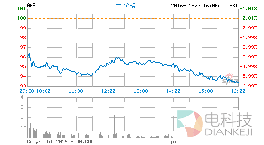 新浪科技讯 北京时间1月28日早间消息,在宣布iPhone出货量增速创历史最低记录,并预计本季度营收将出现13年来的首次下滑后,苹果股价周三下跌6.55%,创两年最大单日跌幅。