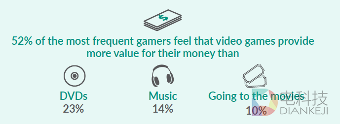 拥有游戏主机的游戏玩家除了在主机上玩游戏外,进行其他活动的比例两年几乎没有太大差别,2016 年用主机看电影的比例下降了 4 个百分点。2016 年的数据为:50% 看电影,34% 看电视节目,28% 听音乐,21% 观看直播或其他内容。
