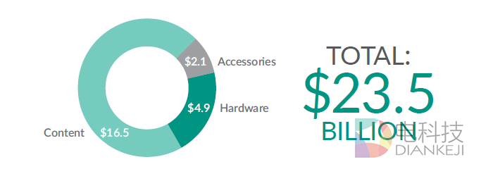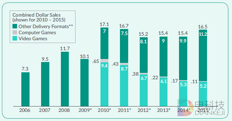 从 2009 年开始可以看到电子游戏销售额(浅绿色)逐年下降,深绿色表示的是订阅、数字版、移动应用、社区游戏等。可以看到在总销售额变化不大的这几年的情况下,比重正在逐年增加。