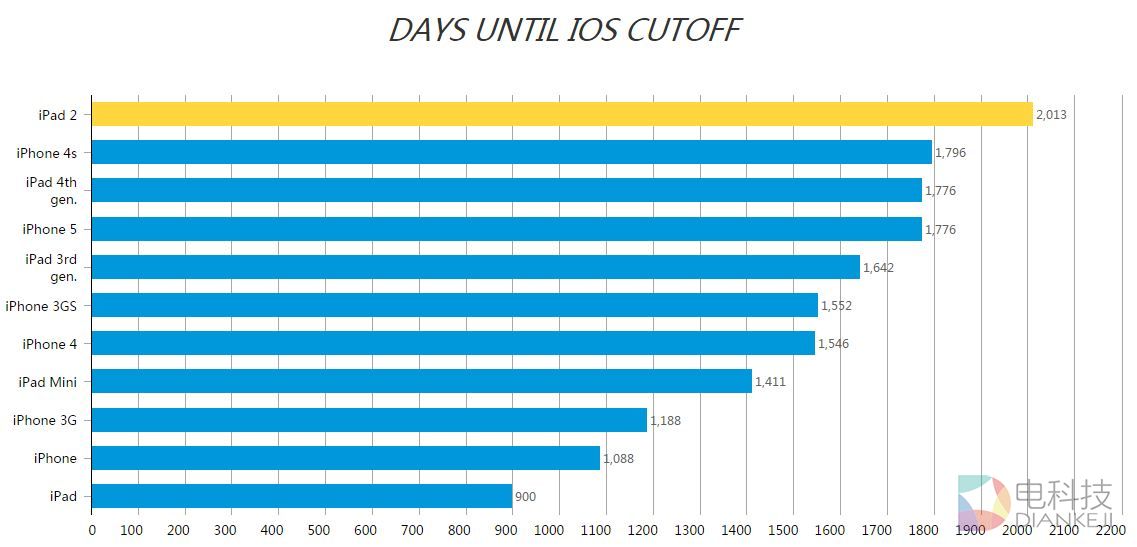 这一榜单上排名前列的是iPad 2。这款平板电脑于2011年春季推出,当时搭载的系统是iOS 5。这款产品的销售周期达到3年,而对新版iOS系统的支持时间甚至更长。苹果自2014年以来不再销售iPad 2,但直到本周推出iOS 10时,苹果才停止对iPad 2的软件支持,总计的软件支持时间达到2013天。