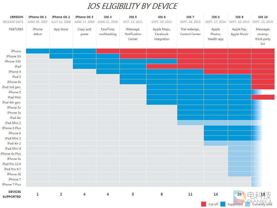 本周,苹果推出了iOS 10、iPhone 7和iPhone 7 Plus。《华尔街日报》随后对以往所有iPhone和iPad进行了研究,列出了每款硬件支持最新软件的周期。外界一般认为,苹果会逐步停止对老硬件的支持,以促进新硬件的销售。实际上,苹果对产品的支持时间正越来越长。