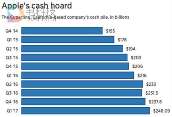截至2016年12月31日,苹果公司的现金储备已经达到惊人的2460.9亿美元,创下历史新高。下图是苹果每个财季的现金储备变动情况,不难看出,苹果公司近几年的现金储备基本维持了稳步增长。