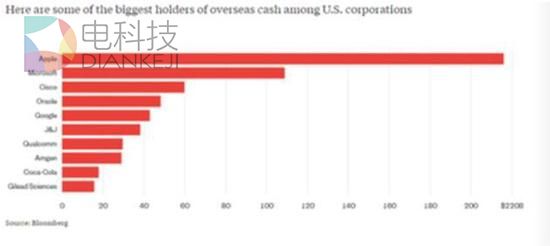 据美国国会估计,美国跨国公司共计有2.6万亿美元利润留存在海外。从上市公司数据看,科技和医药企业是海外留存资金的主要持有者。下图为彭博整理的海外现金最多的部分公司,苹果公司稳居榜首,其次是微软和思科。