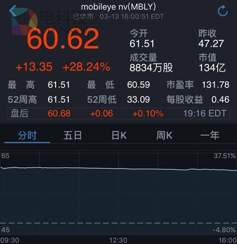 截至周一收盘,Mobileye股价上涨13.35美元,涨幅达28.24%,报收于60.62美元,市值达134亿美元。
