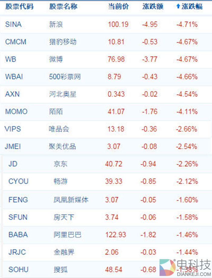 北京时间5月24日,美国股市周二收盘中概股多数下跌,陌陌跌4.11%,报41.07美元,京东跌2.26%,报40.72美元,阿里巴巴跌1.46%,报122.93美元。